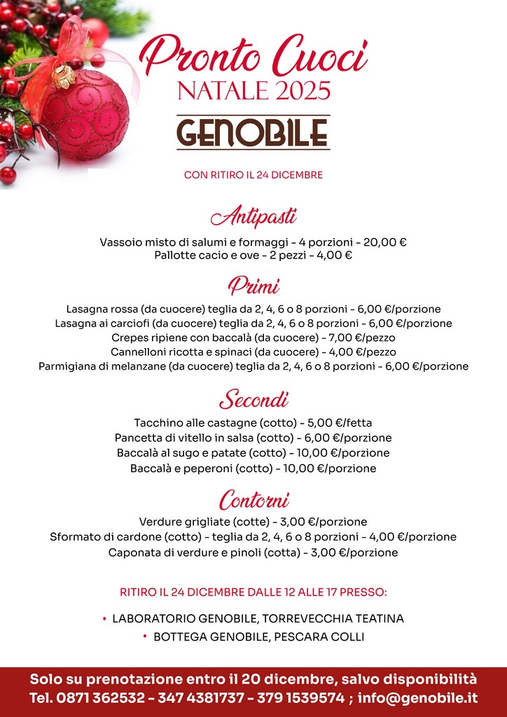 Il Natale è il momento più atteso dell’anno, quando la tavola diventa il cuore della festa e il buon cibo unisce famiglie e tradizioni. Anche per il 2025, Genobile presenta il suo esclusivo Menu Pronto Cuoci, pensato per chi desidera portare in tavola qualità artigianale, sapori autentici e tutta la comodità di piatti già pronti da cuocere o riscaldare. Una selezione completa che spazia dagli antipasti ai secondi, con ricette della tradizione abruzzese preparate con ingredienti genuini e la cura di sempre. Basta prenotare, ritirare e servire: al resto pensiamo noi.